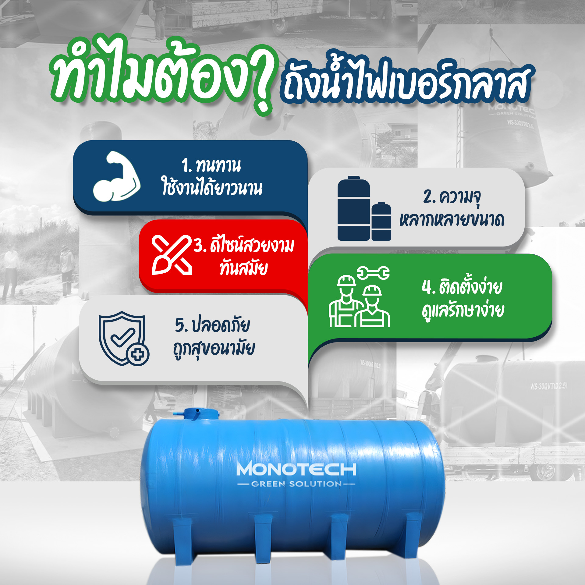 - ทนทาน ใช้งานได้ยาวนาน: ผลิตจากวัสดุไฟเบอร์กลาสคุณภาพสูง ทนทานต่อสภาพอากาศ ไม่เป็นสนิม กรด ด่าง หรือสารเคมี เหมาะกับการใช้งานในสภาพแวดล้อมอุตสาหกรรมที่มีความเสี่ยงต่อการกัดกร่อน อายุการใช้งานยาวนานถึง 20 ปี ช่วยประหยัดค่าใช้จ่ายในการเปลี่ยนถังน้ำใหม่บ่อยครั้ง