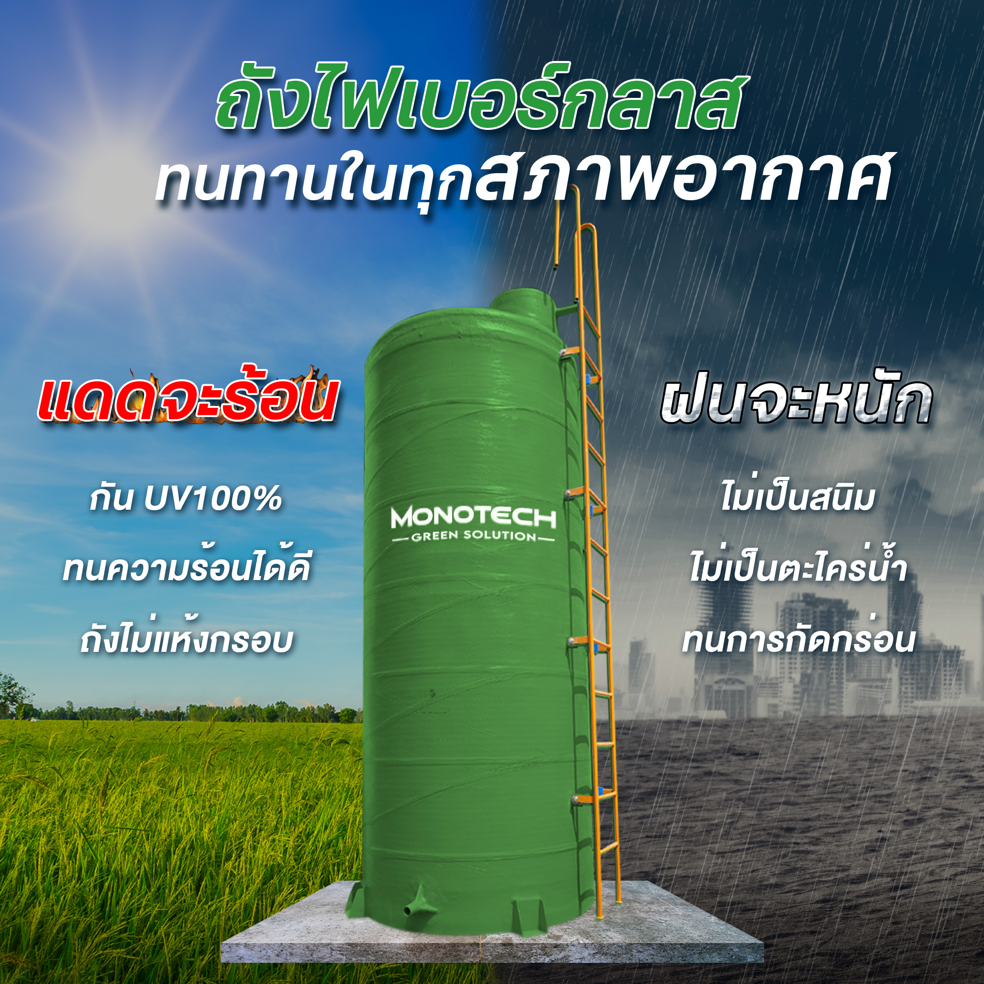ไฟเบอร์กลาสมีความสามารถในการทนต่อสภาพอากาศที่รุนแรง ไม่ว่าจะเป็นแสงแดด ฝน หรืออุณหภูมิที่สูง-ต่ำ ถังเก็บน้ำไฟเบอร์กลาสไม่เกิดการเปลี่ยนรูปหรือแตกร้าวเมื่อถูกสัมผัสกับสภาพอากาศที่เปลี่ยนแปลงอย่างรวดเร็ว นอกจากนี้ ไฟเบอร์กลาสยังมีคุณสมบัติในการป้องกันรังสี UV ทำให้ถังเก็บน้ำไม่เกิดการเสื่อมสภาพเมื่อใช้งานในที่ที่มีแสงแดดจัด