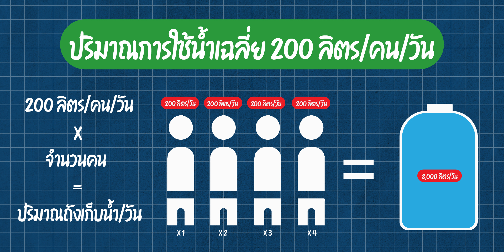 - จำนวนผู้อยู่อาศัย: คนในอาคารหรือบ้านแต่ละคนจะใช้น้ำปริมาณที่แตกต่างกันไป โดยเฉลี่ยแล้วคนหนึ่งคนจะใช้น้ำประมาณ 150-200 ลิตรต่อวัน